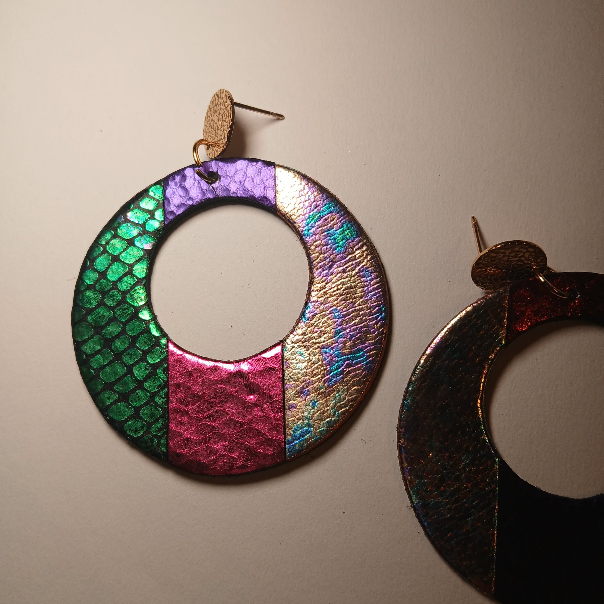 Boucle d'oreilles en cuir fantaisie irisé, holographique, paillettes, de la "Gamme CREOLES".